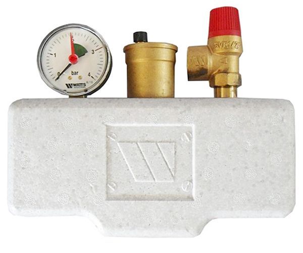 Группа безопасности котла KSG 30/20M предназначена для защиты закрытых систем отопления от избыточного давления и завоздушивания. Включает в себя предохранительный клапан, автоматический воздухоотводчик (с запорным клапаном) и манометр, смонтированные на стальной консоли в теплоизоляции.